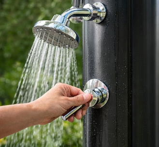 Tá an LY18L01 is equipped with a large rain shower head that provides a refreshing shower experience with a wide spray. The shower head is adjustable up to 180° via its integrated ball joint, allowing users to customize the direction of the water flow. Whether you prefer a direct, focused stream or a gentler, more dispersed spray, the adjustable rain shower head delivers a satisfying and personalized experience. The large shower head adds to the luxurious feeling of the LY18L01, making it perfect for those who want to feel like they are under a gentle rainfall while enjoying a soothing outdoor shower. This feature enhances the overall shower experience, making it a desirable choice for homeowners and businesses alike.